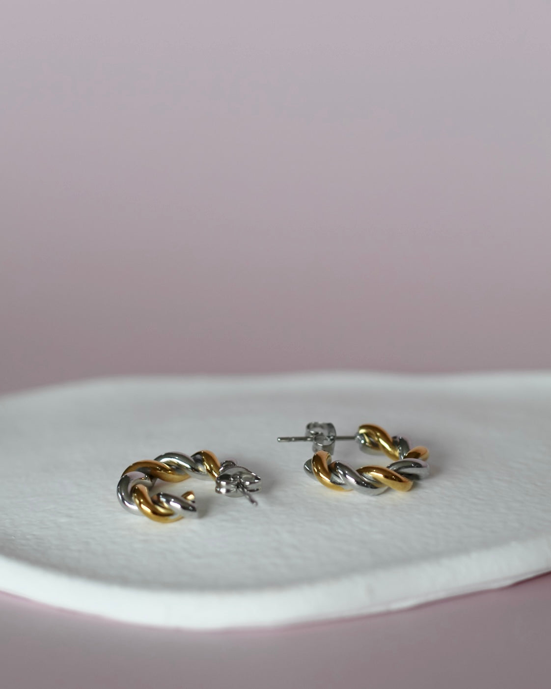 These twisted hoops feature a striking two-tone finish, blending cool silver and warm 18k gold-plated stainless steel for a bold yet versatile look.