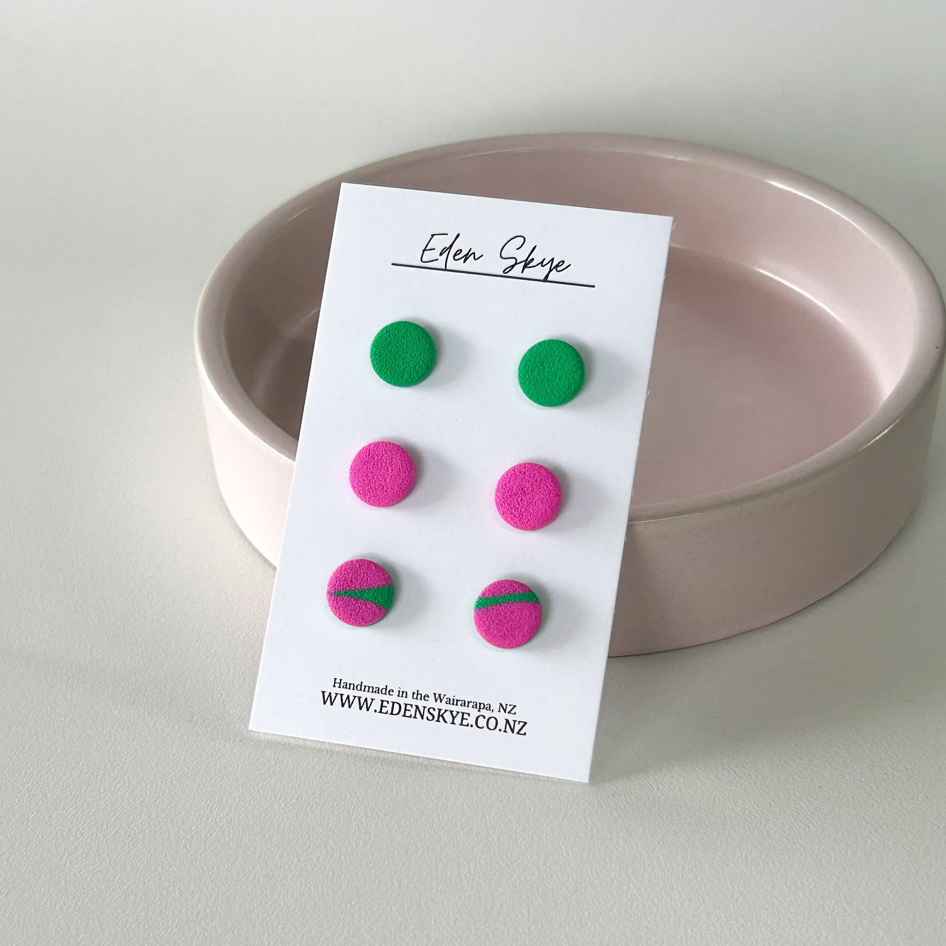 The bottom set of studs are cut from a slab, so they will be a mixture of pink and green but won’t necessarily be the ones pictured.